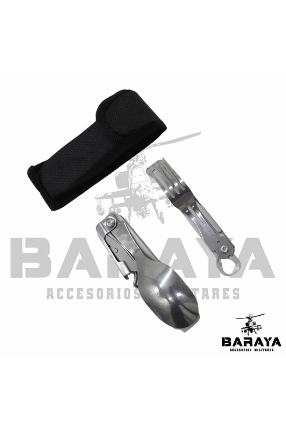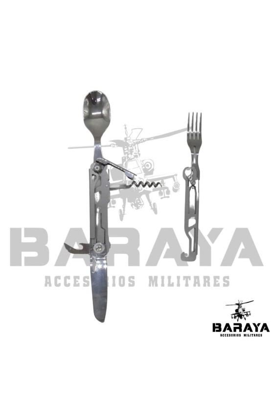 Juego de cubiertos multifuncional, ideal para uso en exteriores y actividades tácticas.