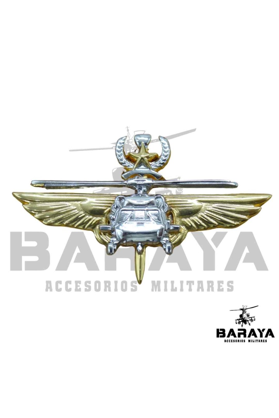 Este distintivo representa el más alto nivel de especialización en operaciones de asalto aéreo. Su diseño integra un helicóptero con alas y una estrella con laureles, reflejando la destreza, liderazgo y experiencia táctica en misiones aerotransportadas. Fabricado en metal de alta calidad, es un símbolo de honor y profesionalismo.